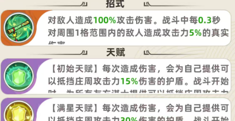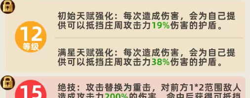 而在12级的时候,其实这里初始的天赋跟满星的天赋都会得到强化,但是一般是给自己带来的护盾效果得到强化,给友方谋士类型角色带来的后盾是不会得到强化的,比如在初始的情况下,12级带来的提升百分比就变成了19%的护盾效果,而在满星的情况下,这里得到的就是38%的伤害数值当中的护盾,最后是最高等级当中15级的情况下,他造成的输出效果当中,可以将基础的攻击变换成重击,对前方1×2个范围之内的敌人来说造成的攻击能力,且都会有200%的伤害,并且在命中敌人之后,可以获得抵挡庄周攻击能力当中100%伤害的护盾,这里的护盾提升百分比就是最高的了。