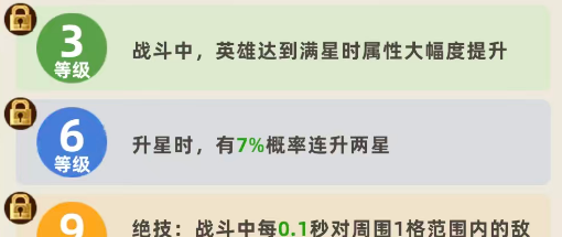 后期游戏当中如果等级得到提升的话,会有一定的功能效果解锁出来,比如在提升到三级的情况下,战斗当中庄周他达到满星的时候,属性的提升还是幅度比较大的,达到6级的情况下,可以给他进行升星,那么此时有7%的概率会让他连续升到两星,这样也会节省一部分的时间资源,如果是升级到9级的话,这里他会解锁自己的绝技效果,战斗当中每0.1秒,就会对周围一个范围之内的敌人,造成攻击能力当中5%的真实伤害,那么此时他的攻速会变快很多,比如之前他在攻速效果当中,基础是每0.3秒才能用一次攻击,而这里0.1秒造成一次攻击的时候,他的整体输出强度都会提升很多。、