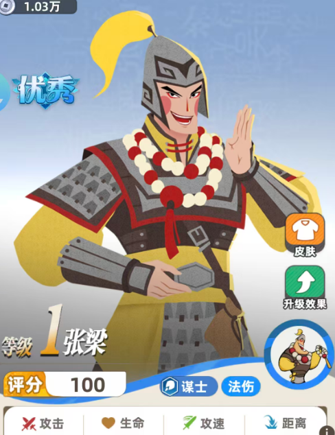 那么今天为大家推荐的也是一个蓝色品质里面强度还可以的英雄,叫做张梁,张梁在游戏当中定位效果还是比较清晰的,目前在谋士队里面,张梁也是可以跟很多的成员放在一起,使用他的评分根据蓝色品质的优秀英雄,只能得到100的评分,但是张梁造成的谋士伤害距离还是可以的,在3格之内可以对敌人进行各种法伤,而且他攻速也是有两秒的,虽然这个攻速相对于其他红色品质的英雄来说是比较慢,但是在蓝色品质的英雄里面,这个攻速已经算是相当不错的了,另外招式效果当中也是一个普普通通的攻击,而且造成的攻击伤害并不是100%,基础的80%,只能选择一个单体敌人进行输出。