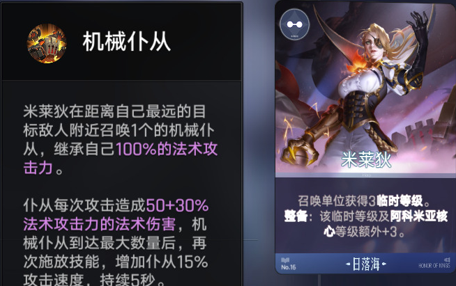 然后给亚连搭配一个米莱狄,米莱狄也是日落海英雄里面比较不错的一个单位,可以提升目前召唤单位当中的临时等级,通过这里触发的整备效果,还可以提升我方核心的能力,在战力不够的情况下,米莱狄是一定要尽快觉醒起来,提供的战力就会非常多,他在距离自己最远的一个目标敌人附近,可以召唤出来一个机械仆从继承他百分百的法术攻击之后,搭配其他输出这里比较推荐的就是安琪拉,她在日落海英雄里面也算是一个比较强势的输出角色,后期在升级的情况上就要看大家自己的经济。