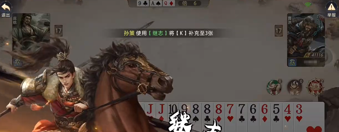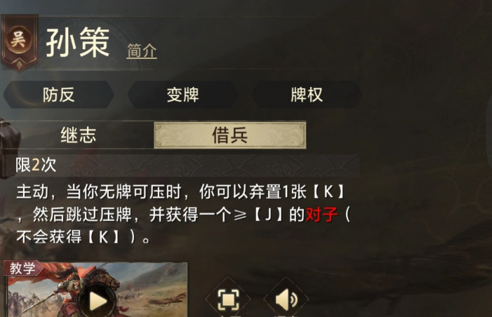 玩孙策大家就要利用先手优势快速打出炸弹,建立压制,后期选择坐骑方面可搭配赤兔马增强出牌连贯性,候选绝影马进一步提升控牌能力玩好孙策,所以他的上手难度只有两星,而技能只能发动3次,当大家无牌可压的时候,大家才可以丢掉一张最大的牌,这样的技能本身很简单,就是大家只要把控一下使用时机,手上大于等于勾的牌越多的时候,去用这个技能效果是越好的,因为大家此时更容易摸到炸弹,就是哪怕摸不到炸弹,再不怎么差三带的牌总是有机会拿到的,而且如果大家的手上有2在,那大家就要考虑,丢掉王牌或者2换来的这个牌收益会不会更大一些,但是犹豫可能就会错过机会,因为他的技能发动时机比较重要,所以玩孙策大家就一定会抓时机。