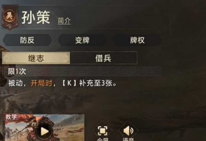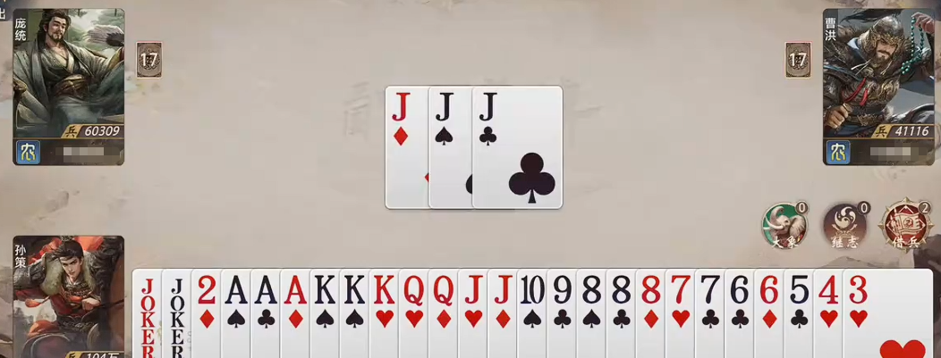 孙策的技能当中第1个技能是就是大家开局的时候,无论自己手中的卡牌有多少张都会给大家直接添加3张J,且不管是什么位置放牌都是一样,如果说大家手上有4张J,利用这个技能再给大家加3张J,就相当于玩家手中有有7张J,所以他的被动非常的逆天,而且这各技能还是不会被阻挡的,一般是开局就发动的,不会被任何场内因素给影响,相对来说其实孙策操作还是比较简洁的,但是技能效果非常适合新手快速上手。