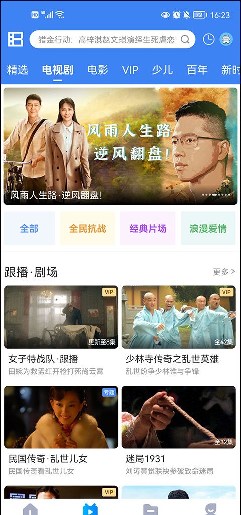 在搜索栏下分四个版块是可以直接跳转的,同时提供播放历史,方便下次观看。