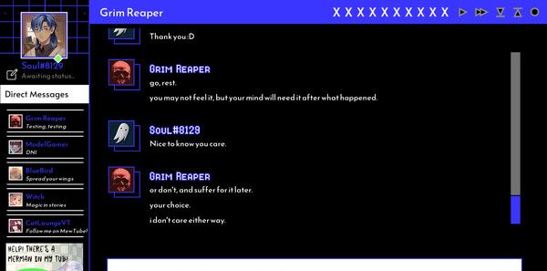 玩家主要通过文字聊天和视频通话与死神展开交流。在聊天过程中,众多选项可供选择,不同选择会影响与死神的关系走向,导向不同结局。当死神提及取走灵魂时,玩家若选择调侃回应,可能会让死神感到窘迫,两人关系朝着轻松诙谐方向发展;若选择严肃质疑,或许会触发死神解释缘由的剧情。