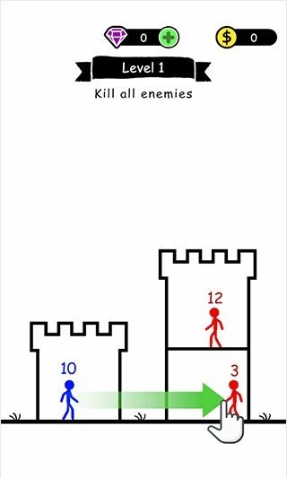 1、火柴人头顶有数字,数字比玩家大的对手打不过,击杀比数字比玩家小的对手后可以吸收他的数字。数字相同的情况下,没武器的角色打不过有武器的角色