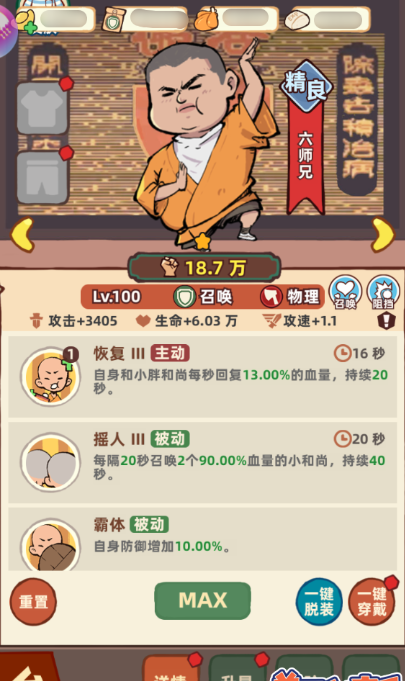 六师兄每隔一段时间,会召唤两个小和尚进入场中,来攻击和吸引敌人;六师兄的被动技能可以增加自己的防御,开启六师兄的主动技能,可以每秒钟给小和尚回复气血。六师兄是前期比较容易获得的召唤伙伴,在前期输出不足,敌人很容易到达老屋的时候,可以选择上阵六师兄试试哦~