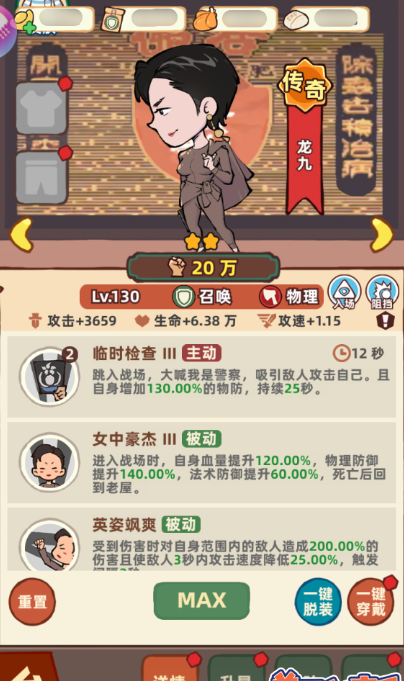 龙九开启主动技能后,会跃入战场,并且会吸引周围的敌人来攻击自己,并且可以增加自己的物防,血量清空或持续时间结束后,会回到老屋;龙九的被动技能可以同时提升自己的物理防御、法术防御和血量,让自己变得更肉,同时还会使攻击龙九的目标受到反弹伤害并降低攻速。龙九的作用十分全面,她的主动技能自带嘲讽效果,强力的被动技能使得龙九更加能抗的同时,还能让龙九造成一定的伤害,可以很好的拖延敌人;并且龙九开启主动技能后或跳到最前方的敌人面前进行嘲讽,也可以有效的保护老屋,建议大侠可以作为主力抗伤伙伴培养~