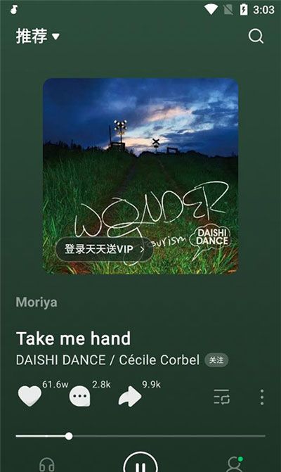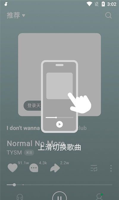 2、音乐的切换则是和抖音短视频一样,采用手动上下滑屏的方式,这也是目前视频音乐App主要的歌曲切换方式。