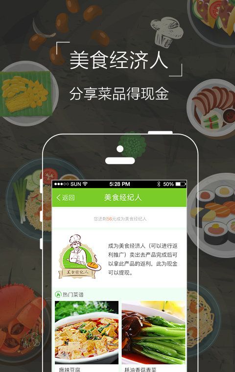美食经纪人做美食赚现金,轻松上传菜谱,和天南地北美食达人切磋厨艺,分享做美食心得感受,让您爱上下厨房的感觉,人人都是美食家。