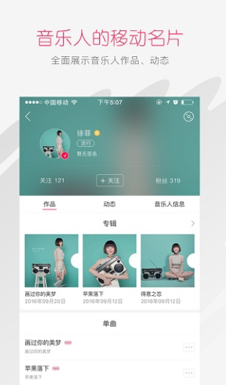 2、音乐人的移动名片,全面展示音乐人作品,动态。