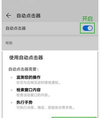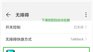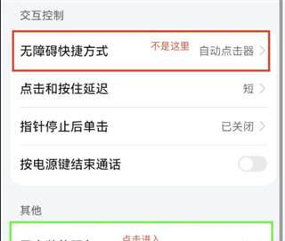 6、注意可能出行的错误设置,部分用户设置了红框的快捷设置,这是错误的,应该是绿色方框中寻找自动点击器进行权限设置。