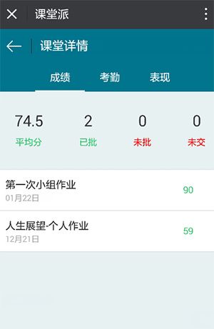 2、点击“课堂详情”,进入课程详情页,即可查询作业的批改状态,并统计出平均分,以及已批,未批,未交的次数;