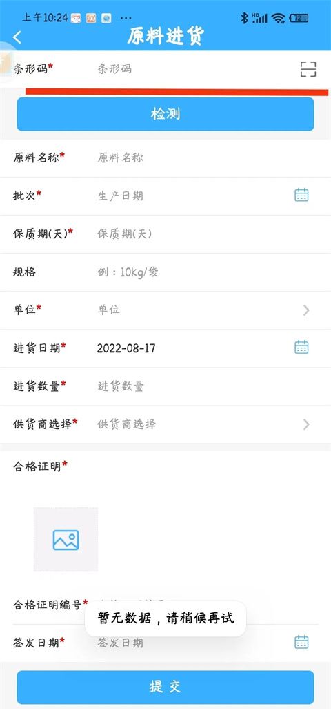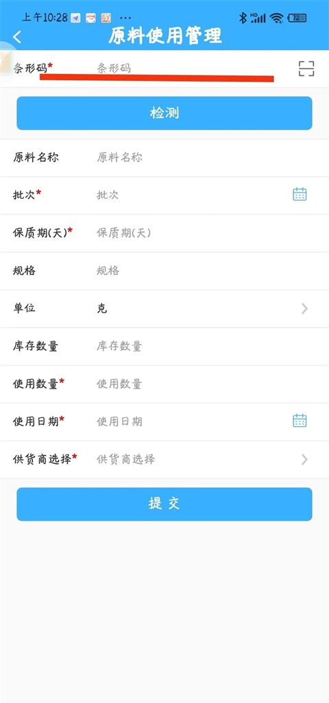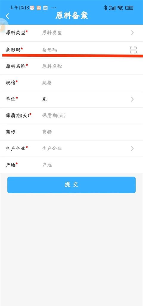 9、首先输入条形码,这里要输入的条形码,就是原料备案时编写的条形码,输入条形码后,其他项目内容会自动弹出,只需要填写购进数量等内容。产品生产所需要的原料必须分别进行“添加”,进行原料购进。 原料使用台账:原料购进后,进入企业库存,企业每次生产,根据需要使用原料,点击右上角“添加”,进行同样的操作,条形码只需要输入备案的原料的条形码,条形码不对,无法进行原料购进或使用。