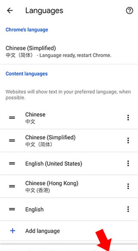6、选择后会回到上一个界面,并且下方弹出重启Chrome的提示,我们点击【Restart Chrome】即可,之后重启谷歌app,我们就可以发现软件内已经变成中文界面了。