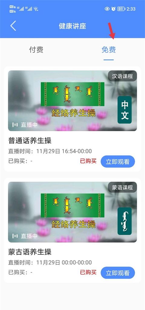 2、想要免费体验的用户可以点击免费栏,点击观看养生操。