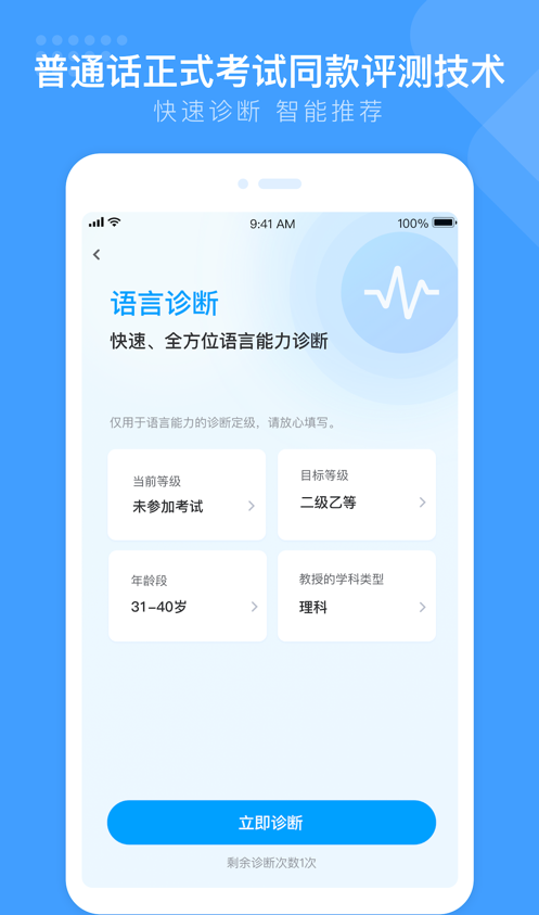 1.准确的语音诊断:参照国家普通话测试标准,全面涵盖各类发音问题,提供实时反馈,掌握每一个发音细节。