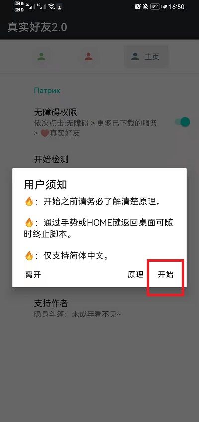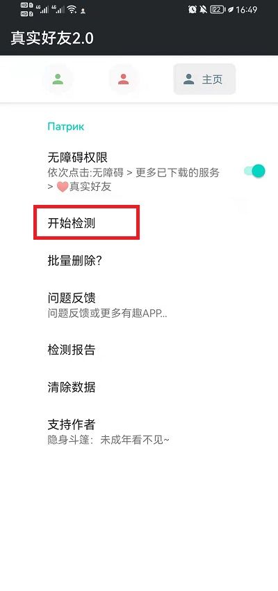 5、打开后返回到李跳跳真实好友软件首页中,然后点击【开始检测】;