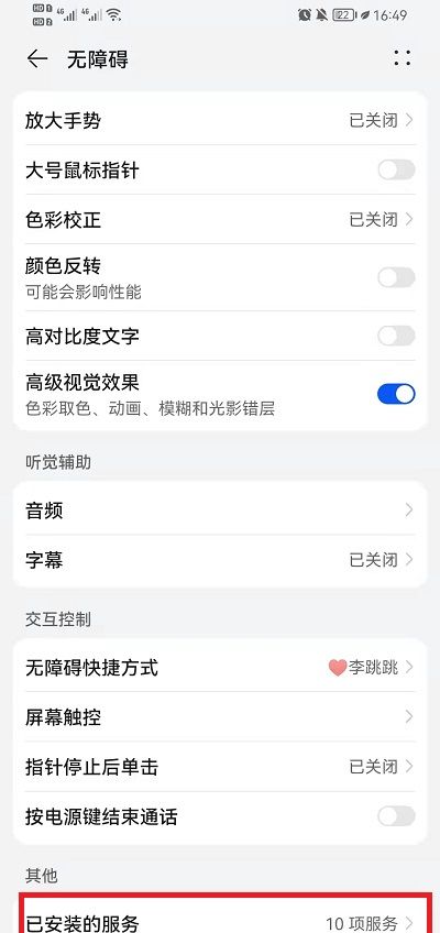 2、然后就会跳转到手机的无障碍设置界面中,我们需要点击【已安装的服务】进入到此功能界面;