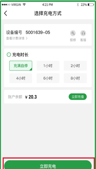 4、进入充电下单页面,选择充电时长后点击立即充电