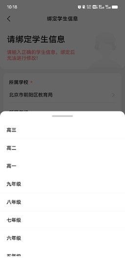 3、选择所属年级,请务必确认,绑定之后的短期时间内是无法修改的