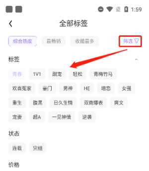 3、例如选择“青春”题材的小说,点击右方筛选还可添加如“1v1”、“甜宠”或“轻松”等更多的标签以更准确的定位