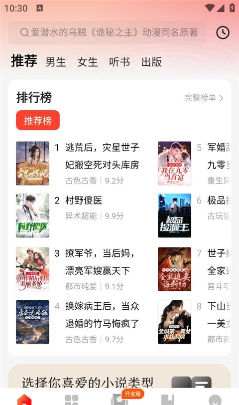 2、在书城界面,有推荐、男生、女生和听书等分类,我们可以选择自己感兴趣的分类,
