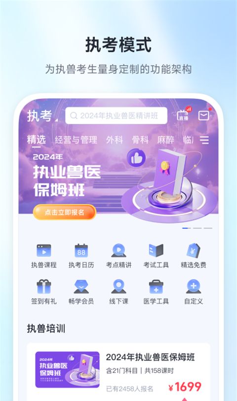 兽课网手机版是专为兽医设计的一站式培训、学习和认证应用程序,让每个人都有30%的阅读时间,并更顺利地通过考试。完整的功能资源,整合医学信息、医学百科全书、医学文献、现场课程、宠物视频和执业兽医培训,旨在帮助兽医教育专业的学生更好地通过考试。该软件为问题提供练习数据,逐一呈现错误答案、正确答案和章节练习问题等数据,帮助每个人更好地了解自己的优缺点。配备完全逼真的模拟,它可以恢复真实的考试环境,让你在考试中不那么紧张。它还具有错误收集功能,允许每个人反复练习,有针对性地加强技能。