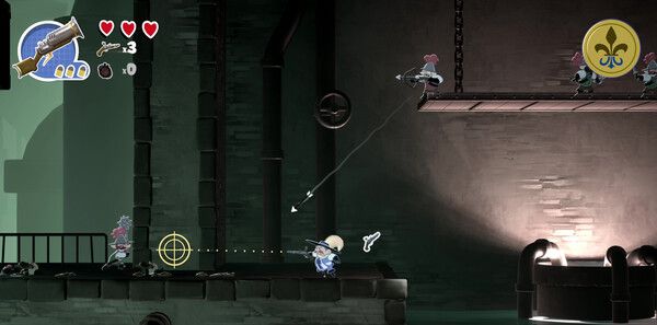游戏采用2.5D横向卷轴视角,以卡通渲染技术呈现法国大革命时期的标志性场景。巴士底狱的砖石结构、蒸汽朋克机械装置与腐化贵族的夸张造型形成鲜明视觉对比。动态光影与粒子效果强化了子弹时间的张力,例如火铳射击时的烟雾轨迹与僵尸喷溅的胆汁特效,均展现出细腻的动画表现力。此外,手绘风格的角色立绘与场景细节(如监狱厨房的油腻铁锅、军械库的锈蚀武器)进一步烘托出游戏的诙谐基调。