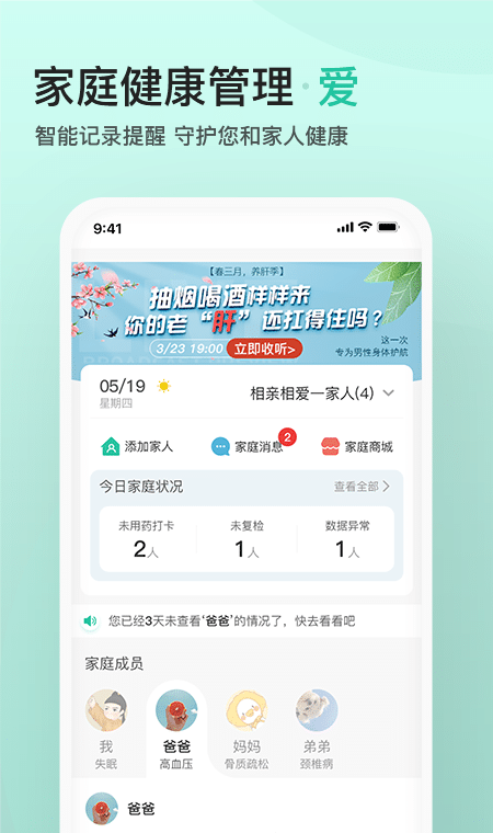 关心一下是一款移动健康养生应用,为你提供各方面的多种养生计划。它是你的私人健康管理者,发现疾病根源,提供科学指导,关爱自己和家人!您可以随时随地管理您的健康,提供健康评估、健康建议、健康商城和健康信息等健康服务。还具备家庭群的功能,可以和家人一起记录健康生活,真正实现亲情的互联互通。用户可以获得他们身体各个方面的数据,使他们能够随时了解自己的健康状况。该软件还具有提醒和分析功能。