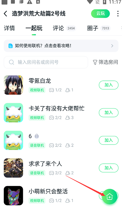 接着第三步。可以加入别人的房间一起联机,也能自己创建房间和朋友一起联机,自己创建房间就点击小房子。