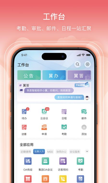 云台为一款专为企业量身定制的移动端办公软件,其核心目标在于助力企业内部构建起一套更为高效、协同的工作模式。它将传统办公场景中的诸多功能巧妙迁移至手机端,使得用户只需轻点屏幕,即可轻松实现OA办公流程的快速审批、重要信息的即时发布、文档的在线编辑与高效管理,以及团队成员间的即时通讯交流,真正做到了工作无界、沟通无限。