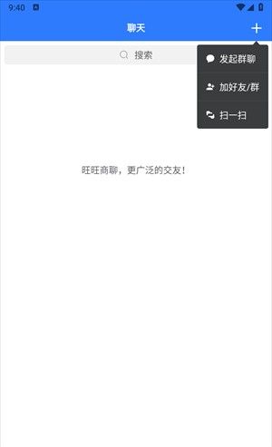 1、打开旺旺商聊,直接进入消息一栏,点击加号,可以发起群聊、加好友还能扫一扫。