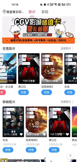 CGV电影是一款优质的影院购票服务软件,能够帮助大家快速购买到你想要观看电影的票据。软件提供电影院信息查询、影片上映查询、在线购票选位等等功能,你可以在这获得超多实惠的购票价格,现在平台还有超多的优惠活动,线上与影城折扣共享,更方便更优惠,全面支持各类优惠券、抵金券、会员卡、星意卡、支付宝等。定期进行限时秒杀、大片预售、幸运抽奖、手机摇一摇等活动。