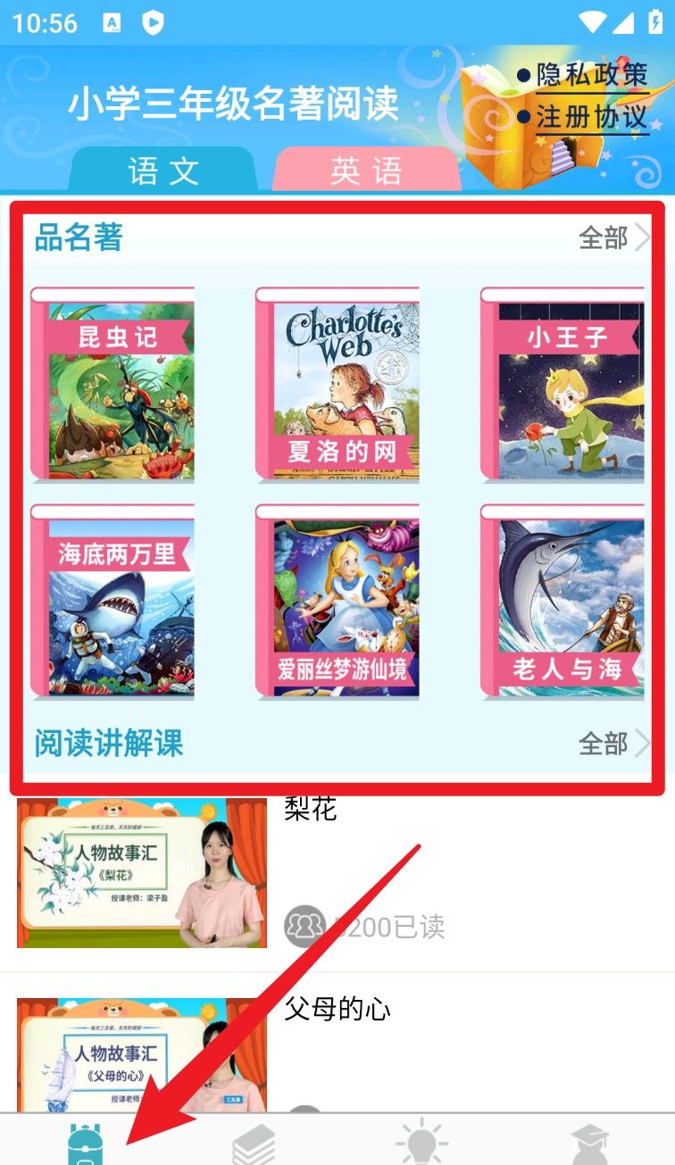 1、进入首页后会显示小学阶段的推荐名著书单,可按语文或英语分类查看,点击封面即可开始阅读。