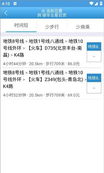 4、查询到的路线按照时间短、少步行和少换乘分类,用户选择自己合适的路线出发即可。