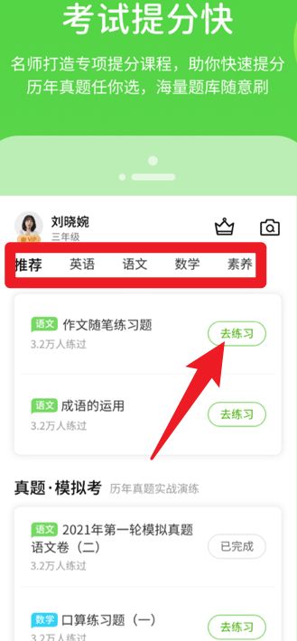 5、在学习课程页面,可选择推荐、英语、语文、数学、素养等模块,进入对应板块进行专项练习与模拟考试。