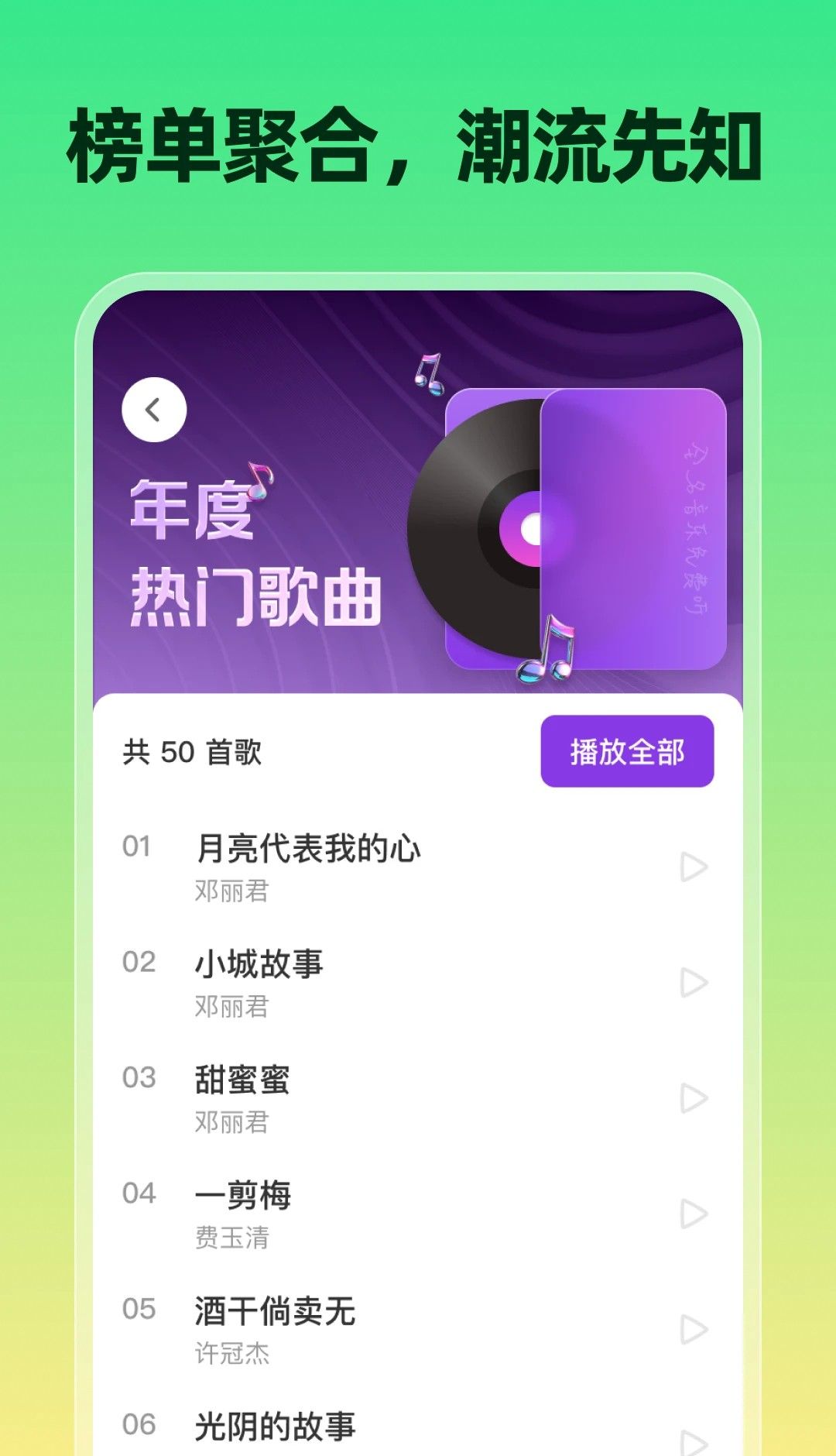 全网音乐免费听是一款全新的热门音乐播放软件,拥有全新的音乐首页设计,可以在里面找到知名音乐平台的精品歌曲资源,随时随地在线听歌播放,还提供全新的音乐播放模式,允许用户灵活切换设置,自由享受优质的音乐播放乐趣,还提供智能化的音乐搜索功能,可以输入音乐名称,歌手等方式进行搜索查找,轻松关注各种热门音乐的更新,能完全满足所有音乐需求,还能自由收藏喜欢的音乐歌曲,有需求的用户欢迎下载软件。
