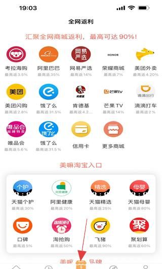 2、全网返利页聚合多平台返利入口,标注各平台最高返利比例,含美嘛淘宝入口,是多渠道购物返利查询页面。