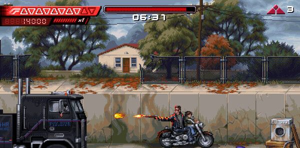 游戏采用复古2D像素风格,以低保真画面重现电影名场面。角色动作帧数细腻,爆炸特效与光影处理充满张力,例如T-1000液态金属变形的动态效果。关卡设计上,Bitmap Bureau融合了赛博朋克都市、未来战场等场景,通过高对比度色彩与像素细节营造压迫感。为增强怀旧氛围,开发团队还复刻了90年代街机游戏的UI设计与过场动画,例如经典“红蓝屏幕”对话界面。