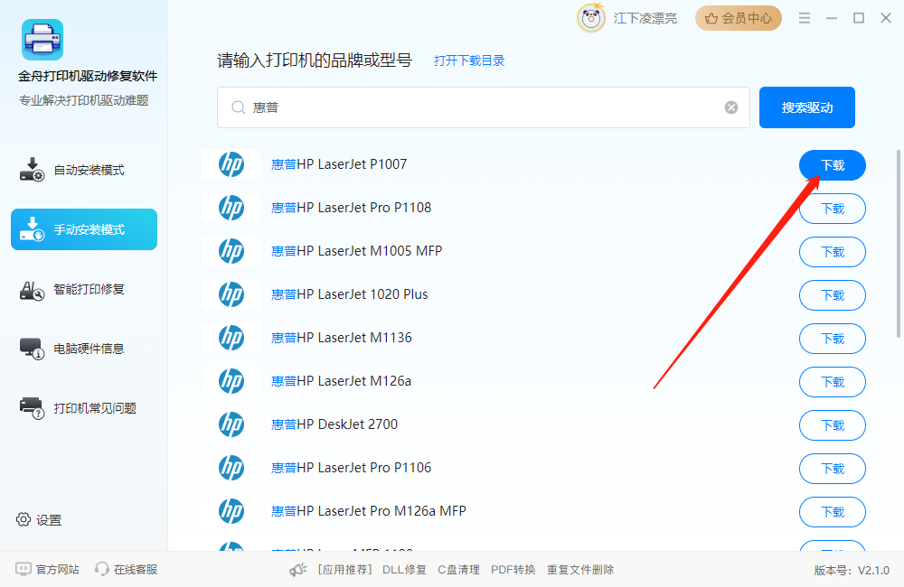 软件提供了手动安装模式,用户可以手动输入打印机的品牌和型号,以便更精确地获取所需的驱动程序