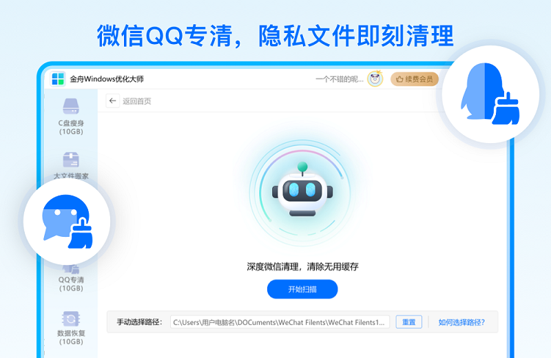 深度扫描微信QQ,分析聊天记录占用情况专业清理微信和QQ的缓存、图片、视频等一键清理守护您的隐私安全。