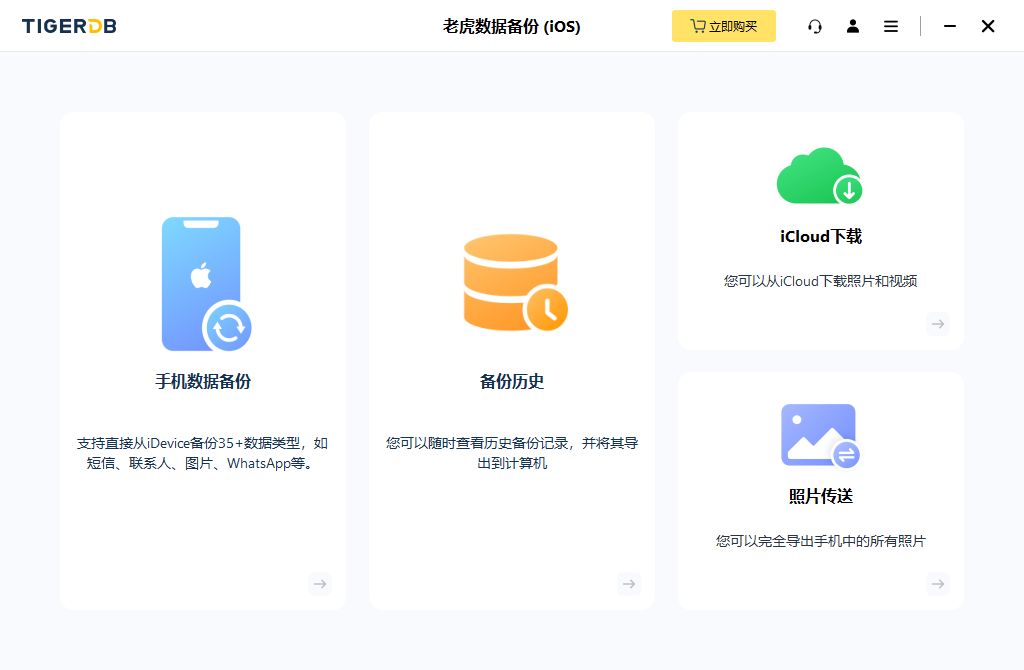 老虎数据备份是一个专业的IOS数据备份软件,兼容所有版本IOS设备,使用USB数据线连接电脑和IOS设备就能进行备份,支持iCloud备份和本地备份,多重备份能够有效保障数据安全。可以备份短信、联系人、备忘录、照片、视频、音乐、日历、QQ、微信等等,几乎覆盖所有有用数据。