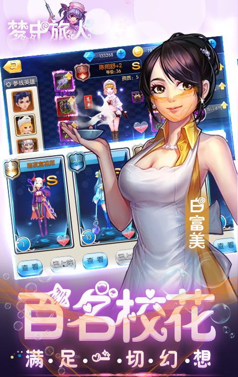 梦中旅人是画面超级绚丽的冒险RPG游戏,这里有最原汁原味的小说剧情,最丰富的养成系统,还有多样化的对战模式和最甜蜜的情缘系统,绝对精彩不断!神秘校花来袭,好好培养她们,成为楚楚动人的女神,一起征战沙场,为了荣誉而战!这里还有甜蜜的恋爱哦,轻松俘获女神芳心。