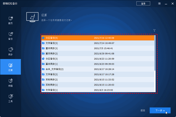 方法一: 点击左侧选项卡上的“恢复”项,然后点击“选择任务”,所有的备份都会列出来。点击需要恢复的镜像文件,然后点击“下一步”。