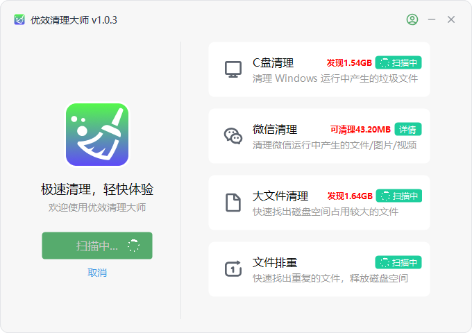 优效清理大师是一款简单易用的电脑清理软件,一键点击就能完成扫描和清理,很适合电脑小白使用。提供多种清理功能,包括C盘清理、微信清理、大文件清理和重复文件清理,还能一键启动所有类型的清理功能,快速完成清理任务。功能强大,可以满足大部分用户的系统清理需求,让电脑运行更加轻快。