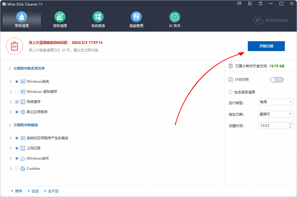 全面清理:可以清理系统垃圾文件,涵盖浏览器缓存、历史记录、下载记录等多种类型,还能清理系统临时文件、日志文件、错误报告文件等,有效释放磁盘空间,提升系统性能。
