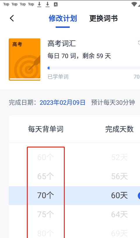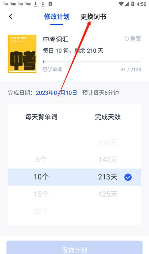 2、这个页面有修改计划和更换词书两个功能,我们点击更换词书。
