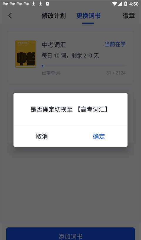 3、是否确定切换为高考词汇,我们选择确定就好了。